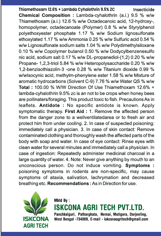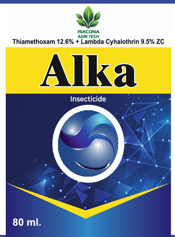 Alka is a broad-spectrum, systemic, and contact insecticide with strong stomach and contact action. The chemical composition includes the active ingredients Thiamethoxam at 12.6% w/w and Lambda-cyhalothrin at 9.5% w/w. It is marketed by ISKCONA AGRI TECH PVT.LTD. and manufactured by ARIANA CROP SCIENCE. This product is toxic to fish and should not be used on crops when honey bees are foraging.